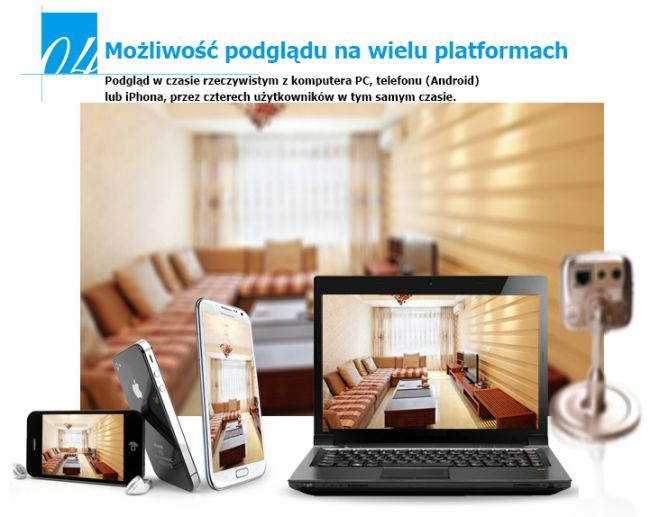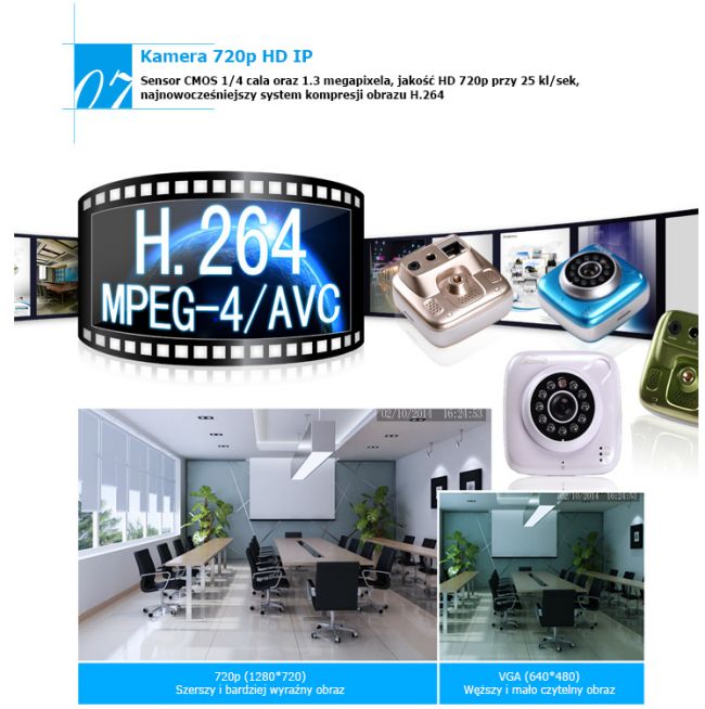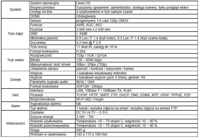 Kamera 720p HD 25kl/sek, kompresja obrazu H.264,