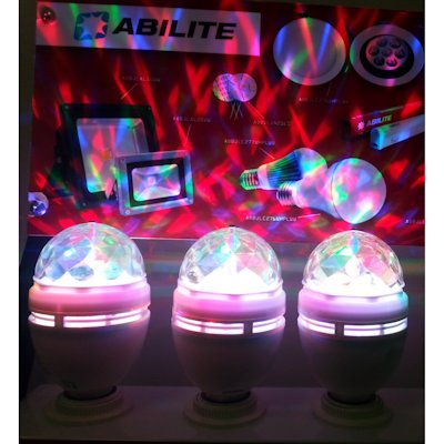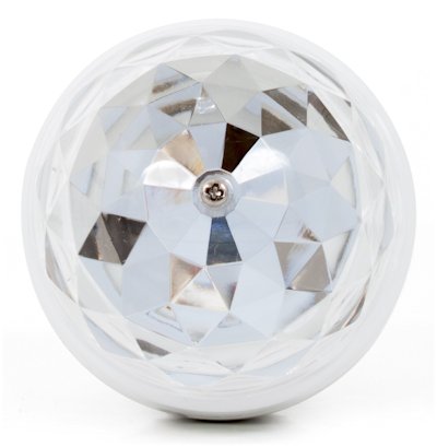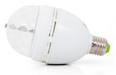 Ta świetna "dyskotekowa" żarówka LED RGB posiada wbudowany silnik poruszający półkulą z lustrami. Daje to niesamowity efekt świetlny uzyskiwany za pomocą 3 kolorowych diod LED.