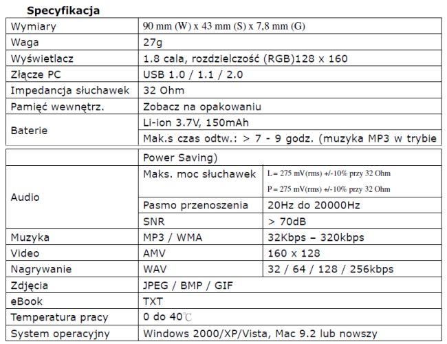 - Czas odtwarzania w trybie muzycznym ok. 8 godzin