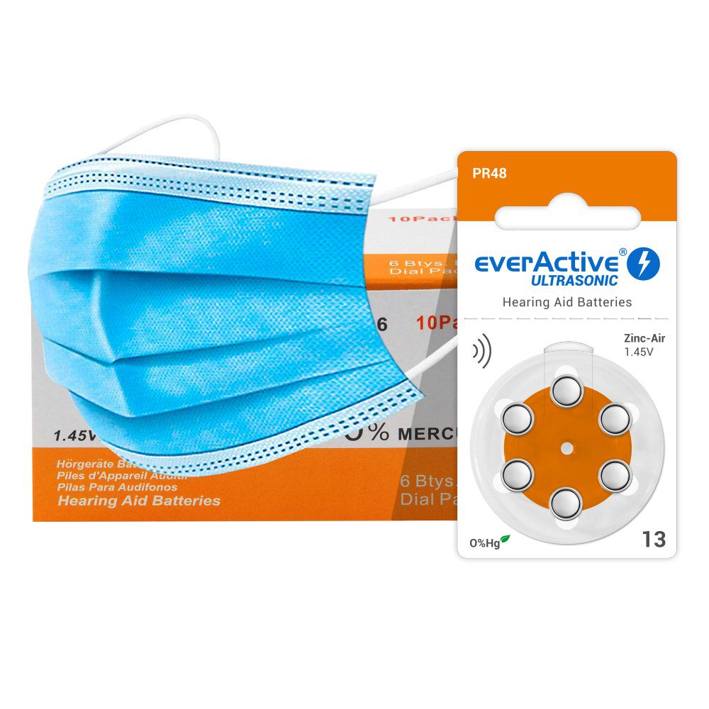 - Ilość: 120 sztuk baterii słuchowych, 6 sztuk jednorazowych maseczek ochronnych 3-warstwowych / chirurgicznych
