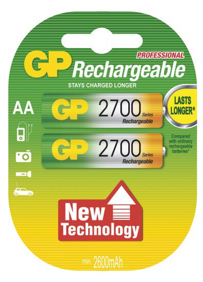 2 akumulatorki Ni-MH R6/AA 2700 wyprodukowane przez jednego ze światowych liderów w dziedzinie produkcji akumulatorków i baterii - firmę GP Batteries.