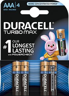 Niezawodne baterie alkaliczne Turbo MAX zapewniają długotrwałą pracę urządzeń takich jak zabawki, latarki, radia, audio-video, gry elektroniczne, piloty. Dzięki technologii Duralock są odporne na wycieki i posiadają długi okres przechowywania, zachowuja moc nawet do 10 lat.Dostarczają do 70 % więcej energii w porównaniu z tanimi bateriami alkalicznymi. Wyposażone w praktyczny miernik naładowania - Powercheck.