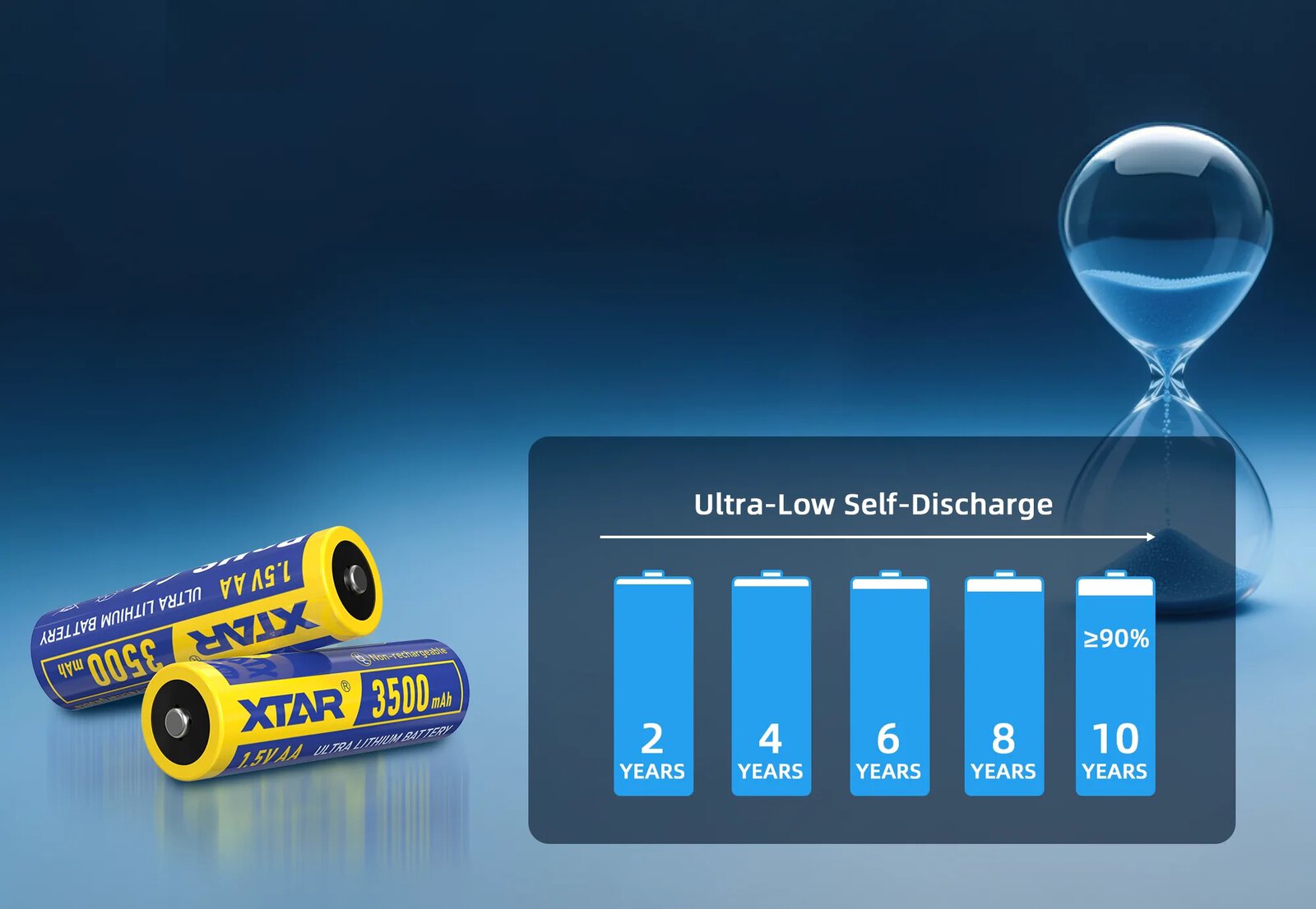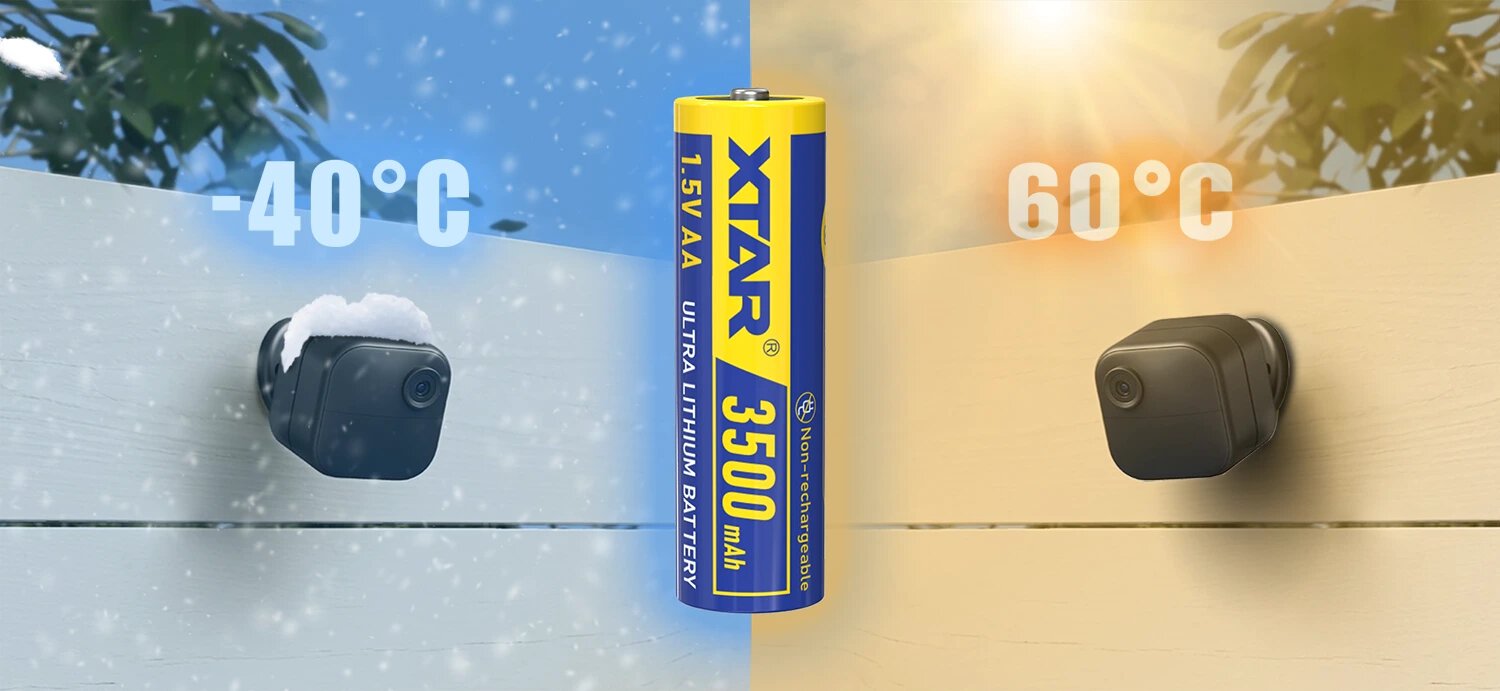 Baterie litowe Xtar Ultra Litihum 3500D AA działają stabilnie w zakresie temperatur od -40℃ do 60℃, zachowując 90% pojemności nawet przy -30℃, podczas gdy baterie alkaliczne często zawodzą w niskich temperaturach i szybko rozładowują się w wysokich.