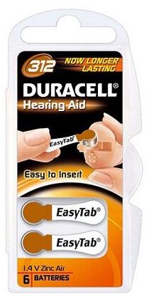 Baterie słuchowe Duracell DA 312 mają Brązową napelkę Easy Tab, ułatwiającą wyjęcie z pudełka i włożenie do aparatu słuchowego.