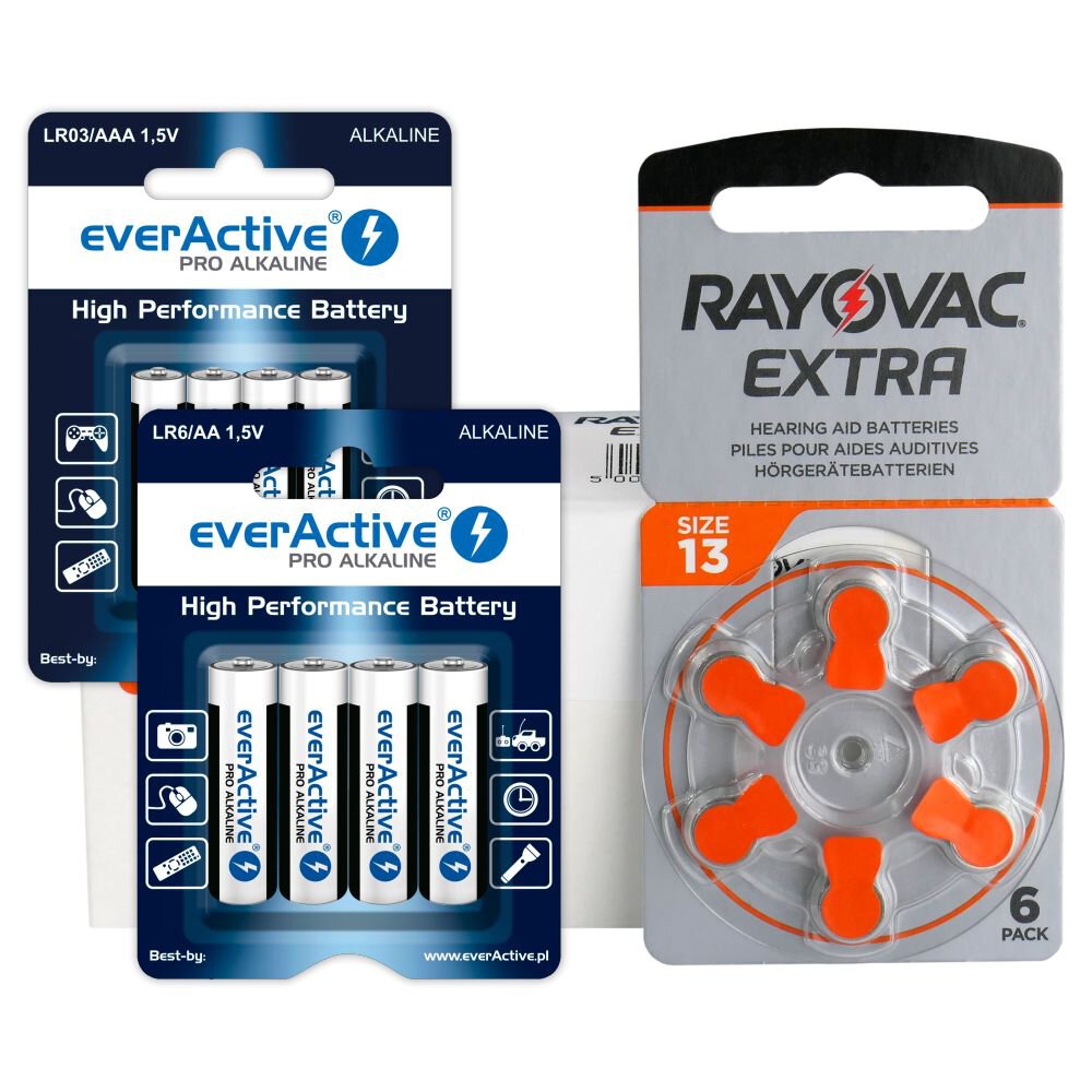 - Ilość: 60 sztuk baterii Rayovac Extra, 4 sztuki LR6 / AA everActive Pro Alkaline, 4 sztuki LR03 / AAA everActive Pro Alkaline