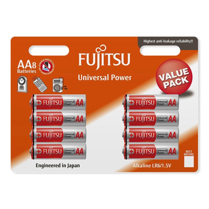 8x bateria alkaliczna R6/AA Fujitsu Universal Power (blister)rodzaj: bateria alkaliczna napięcie [V]: 1.5 średnica [mm]: 14.5 wysokość [mm]: 50.5 opakowanie: blister 8 szt. data przydatności: 2025 oznaczenia: LR6 / AA / R6 / MN 1500 / Mignon / AM3 / E91 Pobierz kartę katalogową produktu