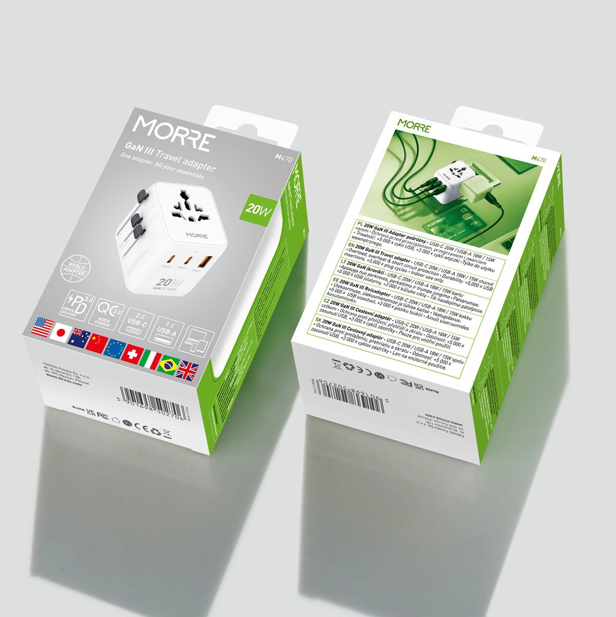 Adapter został wyposażony w obsługę wtyczek USA / Japonia, Australia, Wielka Brytania oraz Unia Europejska. Dzięki temu sprawdzi się idealnie zarówno w podróży, jak i w codziennym użytkowaniu w różnych krajach na całym świecie.