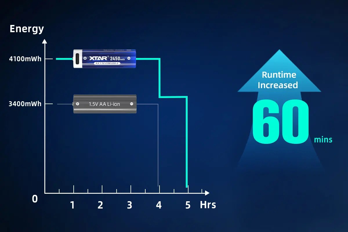 Wydłużony czas działania w porównaniu do innych akumulatorków 1,5V Li-ion dostępnych na rynku