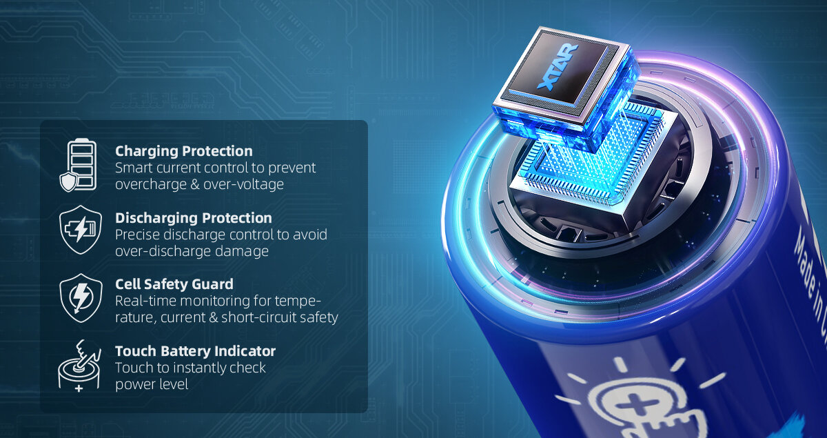 W porównaniu do pozostałych akumulatorów Xtara Li-ion 1.5V ten model został wyposażony w sygnalizację rozładowania oraz szybki podgląd szacowanej pozostałej pojemności. Wbudowana przetwornica specjalnie obniża napięcie do 1.1V, gdy akumulator jest bliski rozładowaniu, dzięki czemu zdążymy w porę wymienić akumulatory. A dodatkową funkcją jest dioda LED, którą pokazuje szacowaną pozostałą pojemność, którą aktywuje się w prosty sposób - poprzez dotyk.