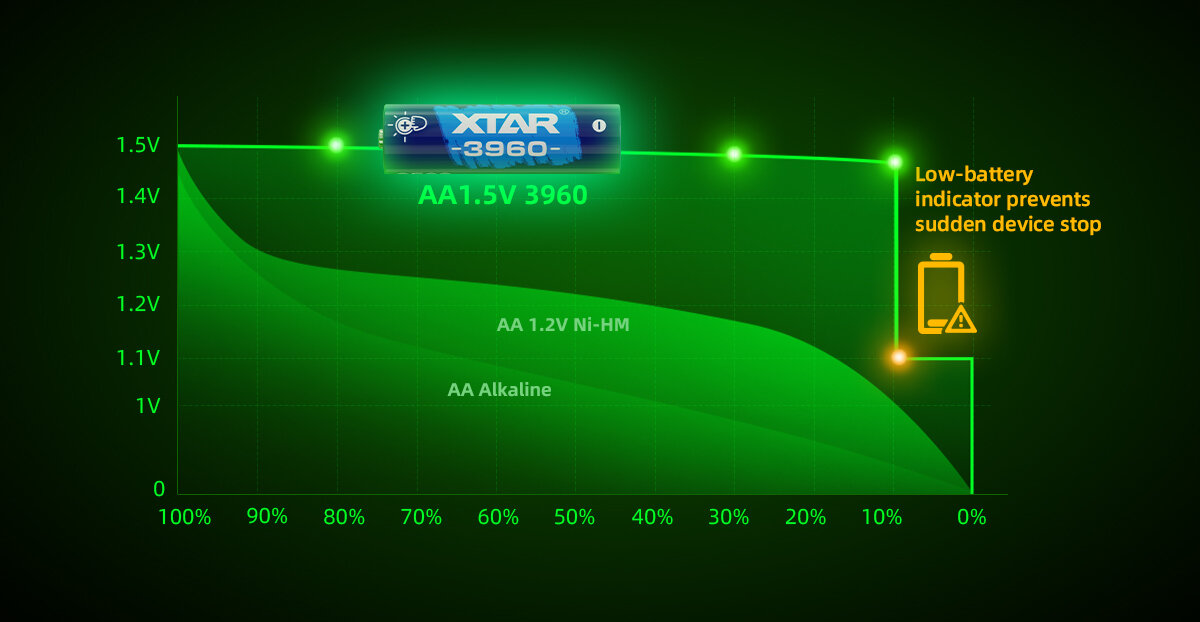 Stałe napięcie wyjściowe 1,5 V oraz wysoki prąd rozładowania do 3 A zapewniają stabilną pracę i dużą moc, z łatwością zastępując tradycyjne akumulatorki Ni-MH oraz baterie alkaliczne alkaliczne. Dodatkowo w końcowej fazie rozładowania, napięcie na akumulatorku spada do 1,1V, dzięki czemu urządzenia mogą zasygnalizować niski poziom naładowania.