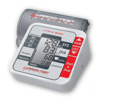 KARDIO TEST KTA 3 BASIC to nowoczesny ciśnieniomierz elektroniczny, w którym zastosowano oscylometryczną metodę pomiaru z zastosowaniem technologii FUZZY LOGIC. Ciśnieniomierz charakteryzuje się wysoką dokładnością pomiaru - równorzędną dokładności pomiarów dokonywanych metodą osłuchową za pomocą sphygmomanometrów mechanicznych przez wykwalifikowany personel medyczny. Dokładność ta została potwierdzona badaniami klinicznymi. Wykonanie dokładnego pomiaru ciśnienia jest niezwykle proste - wymaga przyciśnięcia tylko jednego przycisku. Duży ergonomiczny wyświetlacz LCD zapewnia łatwy odczyt wyniku pomiaru.