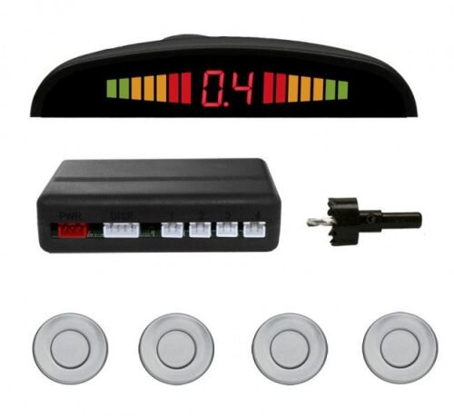 kompletny zestaw do montażu: 4 sensory w kolorze srebrnym, centralka sterująca, wyświetlacz LED na deskę rozdzielczą, otwornica + pełne okablowanie