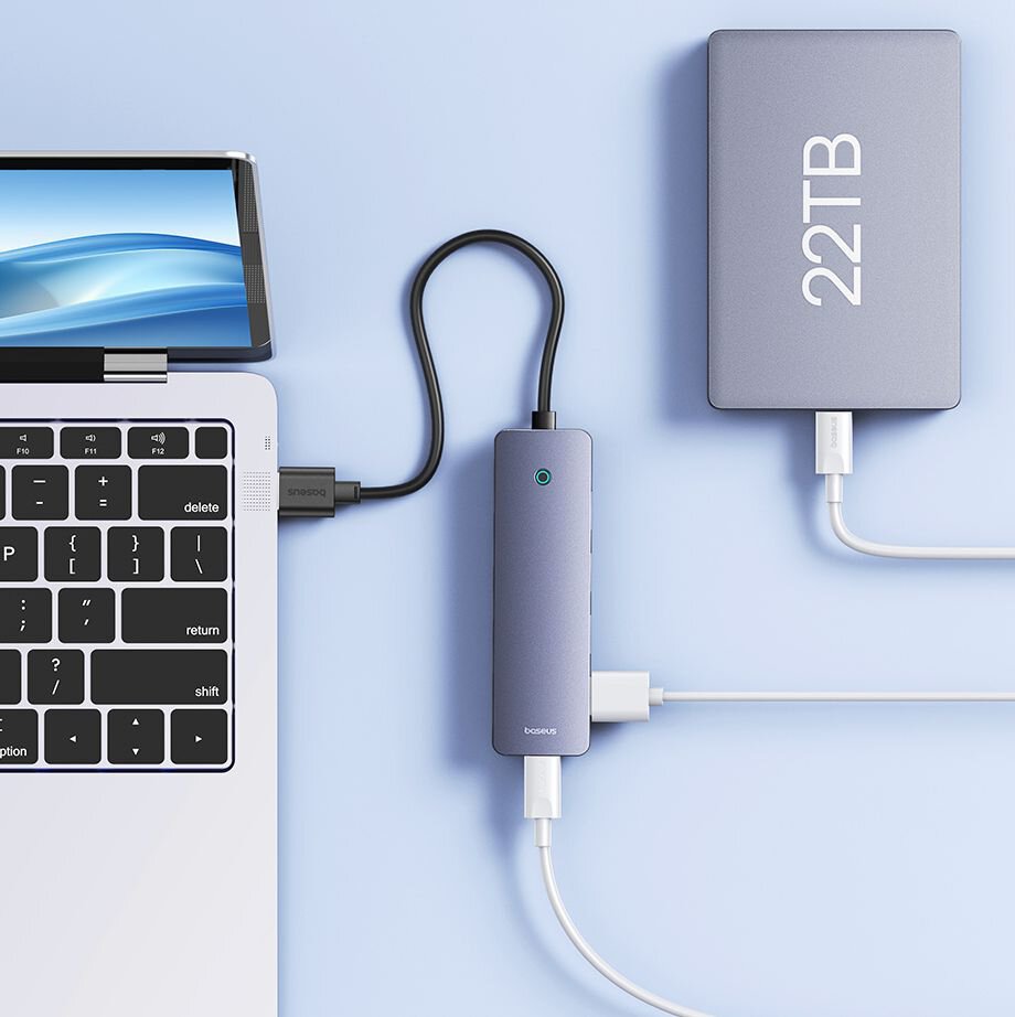 Masz za mało portów USB w laptopie lub komputerze? Hub USB marki BASEUS pozwala w prosty sposób rozszerzyć możliwości Twojego urządzenia. Dzięki czterem portom USB 3.0 oraz dodatkowemu portowi USB-C do zasilania możesz wygodnie podłączyć więcej akcesoriów jednocześnie i cieszyć się stabilną pracą urządzeń.