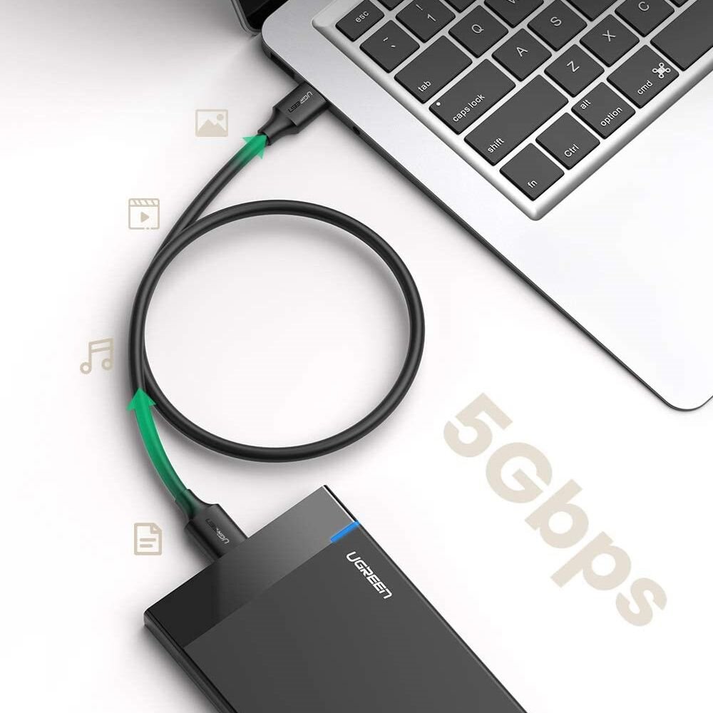 Kabel UGREEN w standardzie microUSB 3.0. Pozwala na szybką transmisję danych do 5Gb/s pomiędzy urządzeniem (np. dyskiem zewnętrznym) a komputerem oraz wydajne zasilanie urządzenia.