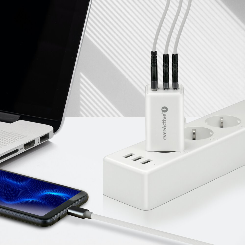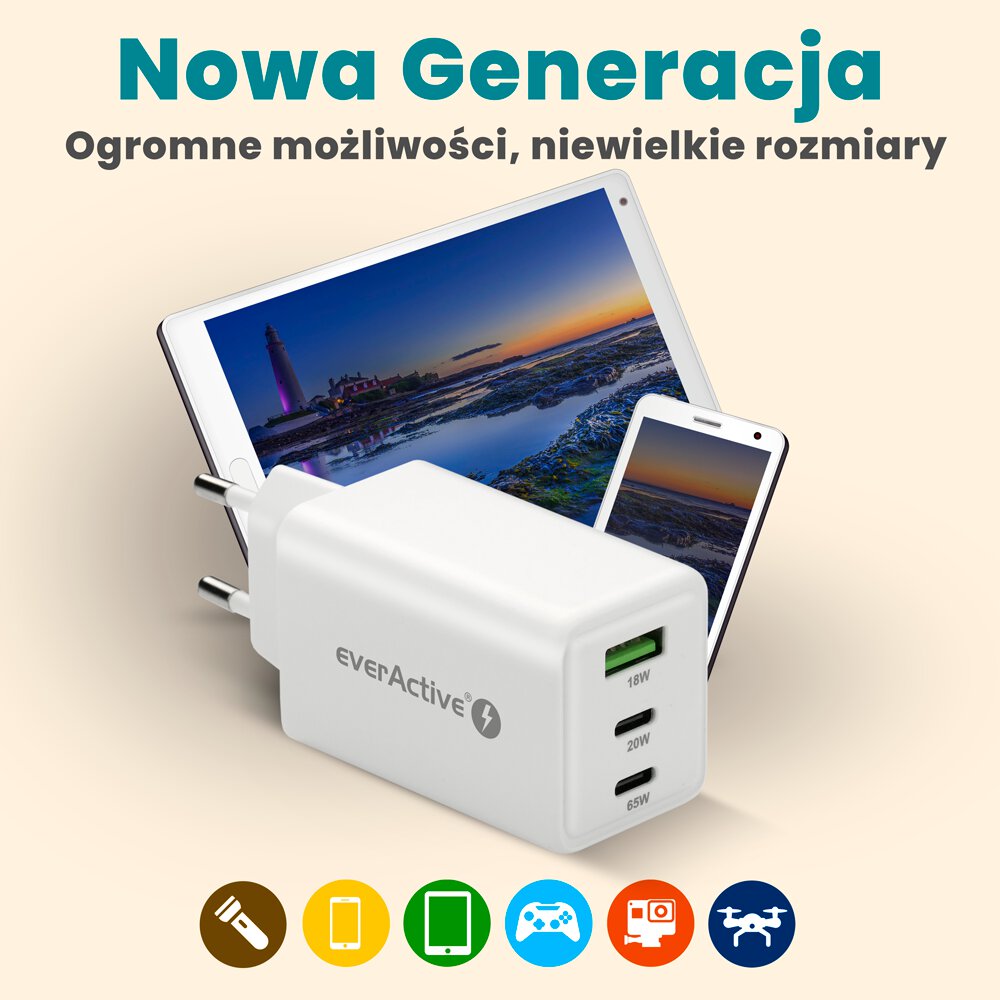 Dzięki zastosowaniu najnowszej technologii GaN, ładowarka od everActive jest o 30% mniejsza niż standardowa ładowarka i w rezultacie zajmuje mniej miejsca. Szeroki zakres napięcia i częstotliwości napięcia - 100-240V ~ 50-60Hz, umożliwia korzystanie z ładowarki w dowolnym miejscu na świecie. Kompaktowy rozmiar ułatwia przechowywanie, co sprawia, że urządzenie idealnie sprawdzi się w podróży.