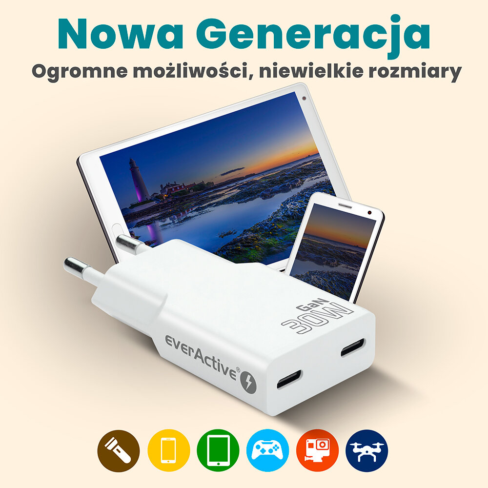 Ładowarka everActive SUPER SLIM to połączenie najnowszej technologii GaN z wyjątkowo kompaktową formą – urządzenie ma jedynie 15 mm grubości, co czyni ją jedną z najcieńszych ładowarek sieciowych dostępnych na rynku.