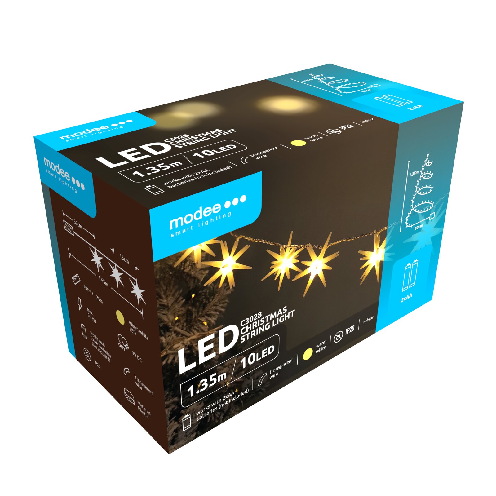 Pod względem rozmiaru dekoracja ma długość 135 cm i wyposażona jest w 10 diod LED. Żarówki w kształcie gwiazdek rozmieszczone są co 15 cm. Łańcuch połączony jest z pojemnikiem na baterie kablem o długości 30 cm, który działa na 2 baterie AA. Przy użyciu wysokiej jakości, trwałych baterii dekoracja może świecić do 3 dni ciągłego użytkowania.
