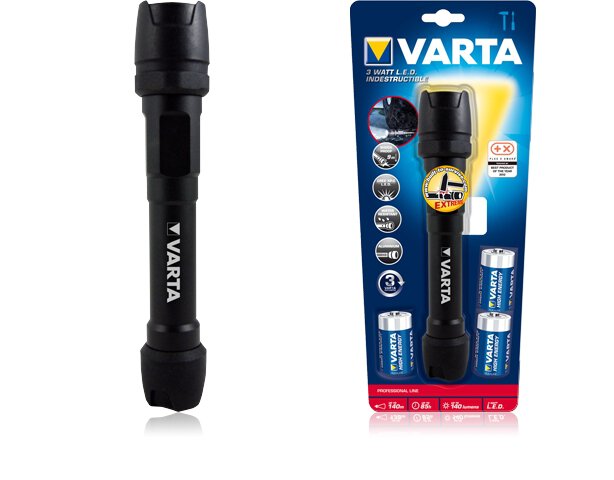 Niezwykle wytrzymała latarka firmy Varta z 'niezniszczalnej' serii ze wzmocnioną obudową odporną na warunki atmosferyczne, wstrząsy i upadki z wysokości nawet dziewięciu metrów.