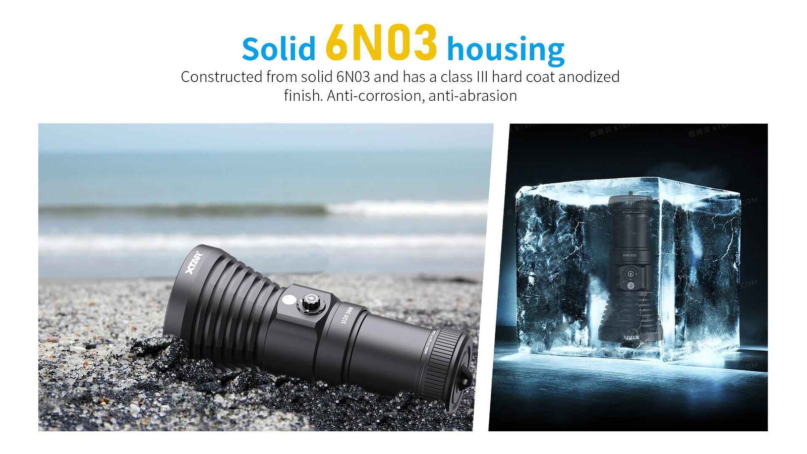 Xtar D28 3600 to wysokiej jakości latarka do nurkowania z oryginalną diodą CREE XHP70.2 P4 oferująca światło o mocy 3600 lumenów i zasięgu aż 550 metrów. Precyzyjnie wykończona, doskonale spasowana obudowa latarki D28 3600 została wykonana z wysokiej jakości stopu aluminium 6N03. Dodatkowo całość została pokryta środkiem antykorozyjnym. Konstrukcja została uszczelniona o-ringami zapewniającymi stopień ochrony IPX8 (wodoszczelność do 100m). Wysokiej jakości kontakty i pozłacane sprężyny zapewniają bardzo dobry styk akumulatora i wysoką odporność na wstrząsy.