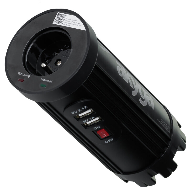 Produkt posiada przełącznik manualny, umożliwiający wyłączenie wszystkich gniazd bez konieczności odłączenia zasilania sieciowego. Dwie diody umieszczone w górnej części informują o poprawnej pracy urządzenia lub ostrzegają o ewentualnych nieprawidłowościach. Okrągły kształt naszej najnowszej przetwornicy idealnie pasuje do większości samochodowych uchwytów na kubek. Produkt spełnia wymogi bezpieczeństwa i wymagania CE.