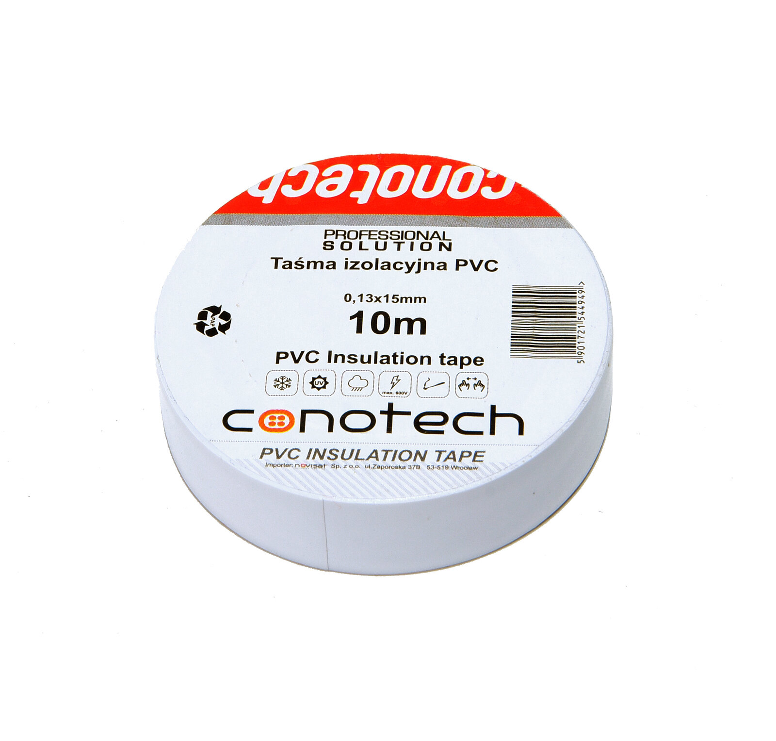Taśma izolacyjna marki CONOTECH jest ekonomiczną, uniwersalną, samogasnącą, miękką taśmą PVC o mocnej powłoce klejącej wykonanej na bazie kauczuku, co gwarantuje wydłużoną wytrzymałość. Opisywany model jest odporny na ścieranie, wilgoć oraz niekorzystne warunki atmosferyczne, co umożliwia stosowanie wewnątrz i na zewnątrz pomieszczeń.