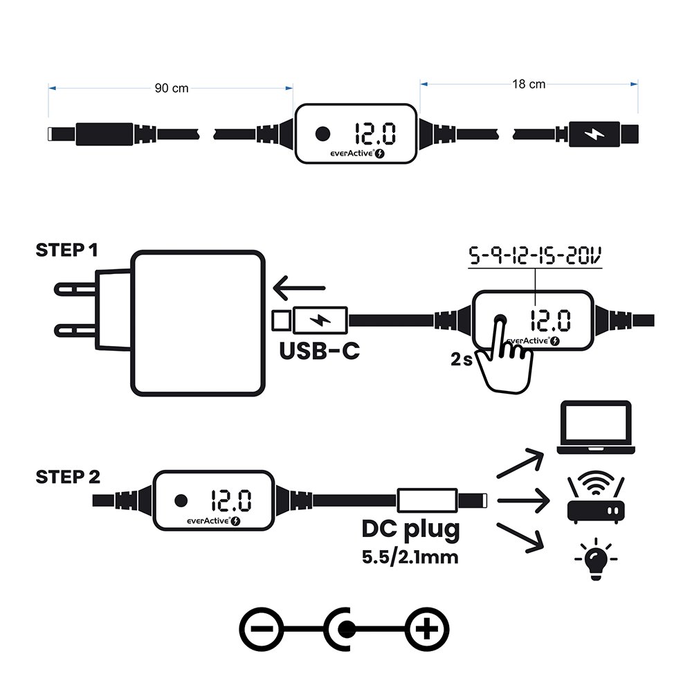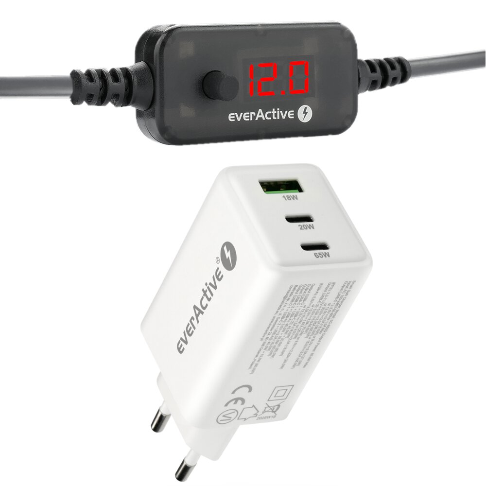 - Uniwersalny zasilacz, selektor napięcia USB-C PD - DC 5V, 9V, 12V, 15V, 20V everActive AD-PD65